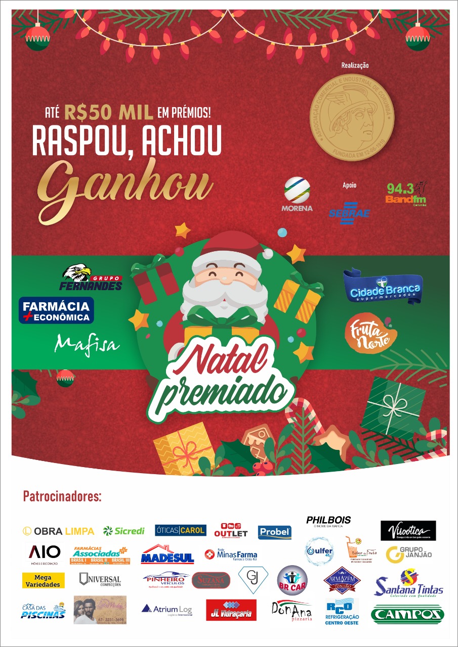 Compre nas lojas participantes e concorra a prêmios instantâneos nas raspadinhas, como vale compras ou descontos, preencha o verso do cupom e deposite na urna identificada da campanha do Natal Premiado 2021 da Associação comercial e Empresarial de Corumbá.