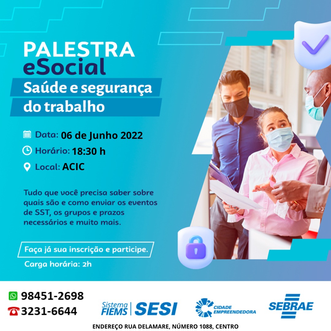 No dia 06 de Junho de 2022, às 18:30h, na Associação Comercial e Empresarial de Corumbá acontecerá a Palestra eSocial - Saúde e segurança do trabalho!!